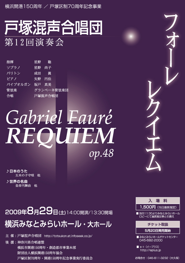 ○曲目(予定): ◆第1ステージ 日本のうた ・汽車ぽっぽ ・赤とんぼ ・谷茶目節 ・五木の子守歌 指揮: 星野 聡 ◆第2ステージ ヨハンシュトラウス作曲 ウィンナ・ワルツ他 ・皇帝円舞曲 ・ラデツキー行進曲 ・南国のばら 指揮: 星野 聡 ピアノ: 矢野円佳 ◆第3ステージ フォーレ作曲「レクイエム」 指 揮: 星野 聡 管弦楽: グランベーネ管弦楽団 ソリスト: ソプラノ)星野尚子 バリトン)成田 眞 オルガン: 坂戸真美 |