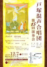 ○日 時: 2013年12月7日(土)14時開演/13時30分開場 ○会 場: 泉公会堂・講堂 ○指 揮: 星野 聡 ○曲 目: 松下耕 作曲 混声合唱とピアノのための四つの日本民謡「北へ」 ピアノ 矢野 円佳 Mark Haye 作曲 Sing Praise Project ピアノ 矢野 円佳 ヴィヴァルディ作曲 「グローリア」 RV589 グランベーネ管弦楽団 ○入場料:1,500円(全席自由) ○お問い合わせ:畑中まで(045-713-9363) ○後援:神奈川県合唱連盟 |